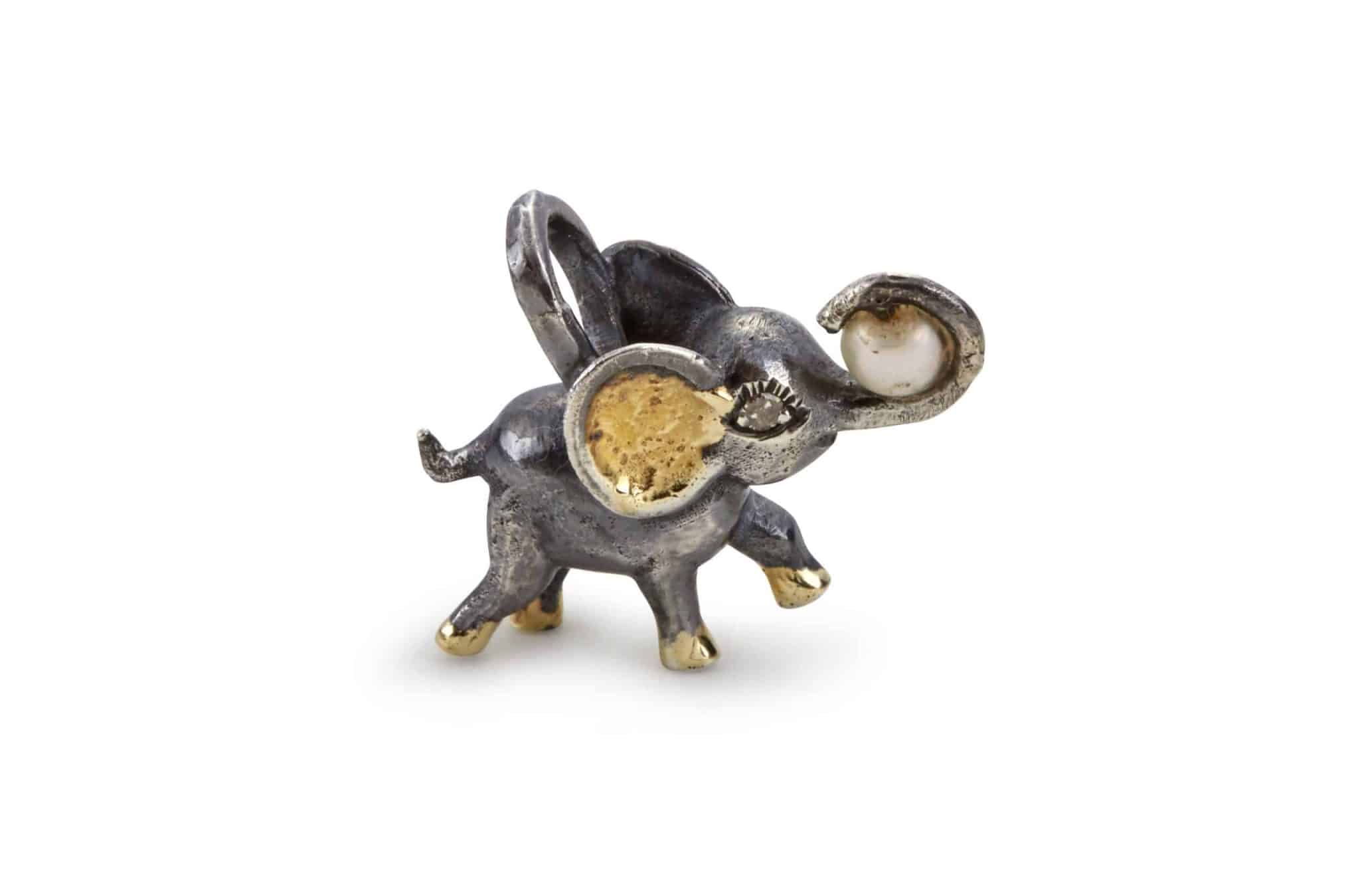 Håndlaget anheng i 925 oksidert sterling sølv med 18 K påvalset gullplater. I snabelen holden elefanten en ferskvannsperle og som øynene har den to 0,04ct runde brillianter.