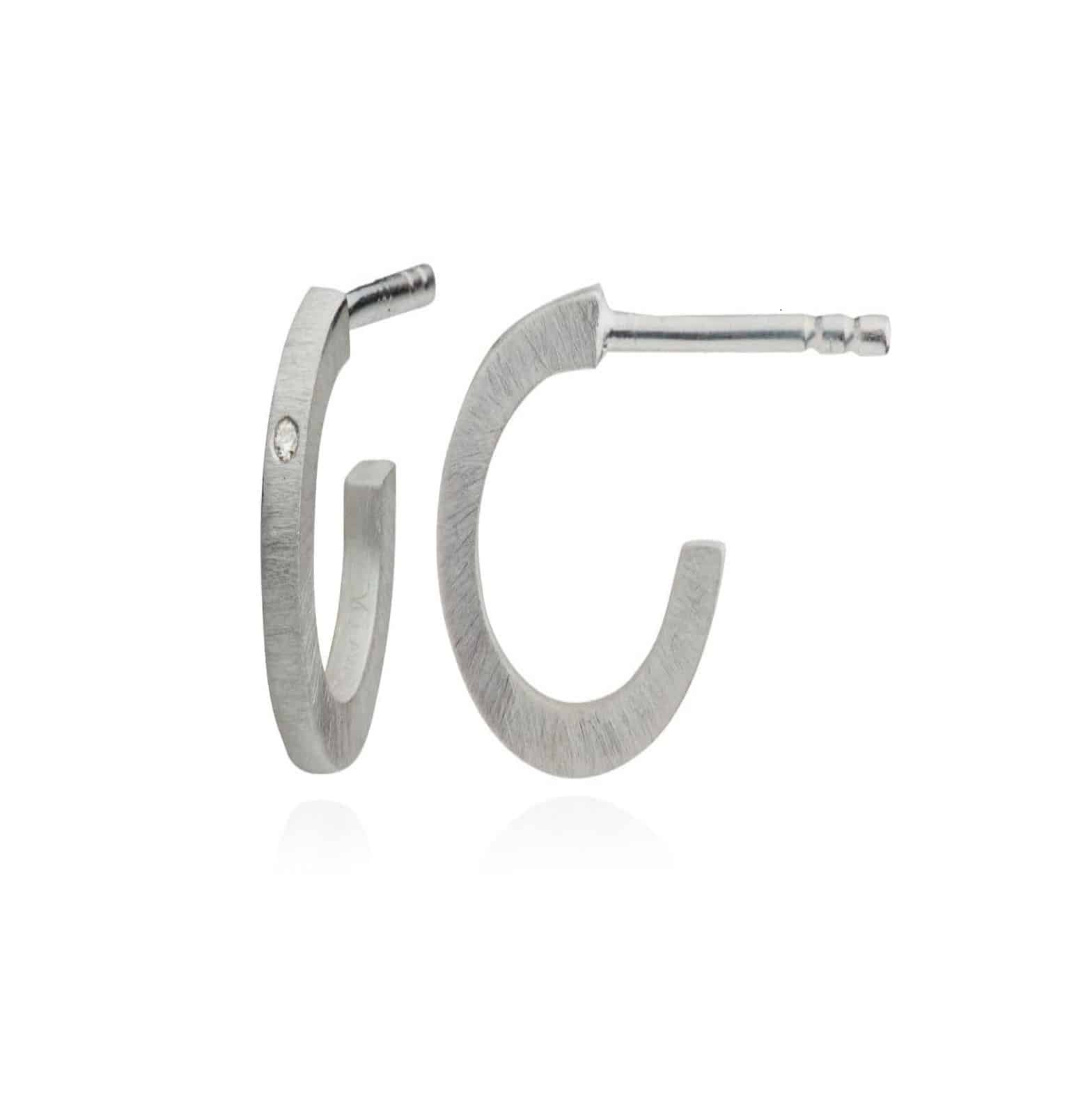 Wille Jewellery “Cosmos” – matte sterling sølv creoler. Creolene er en halvsirkel fattet med 2×0.005ct W/SI. Diameteren på creolene er ca. 10mm.