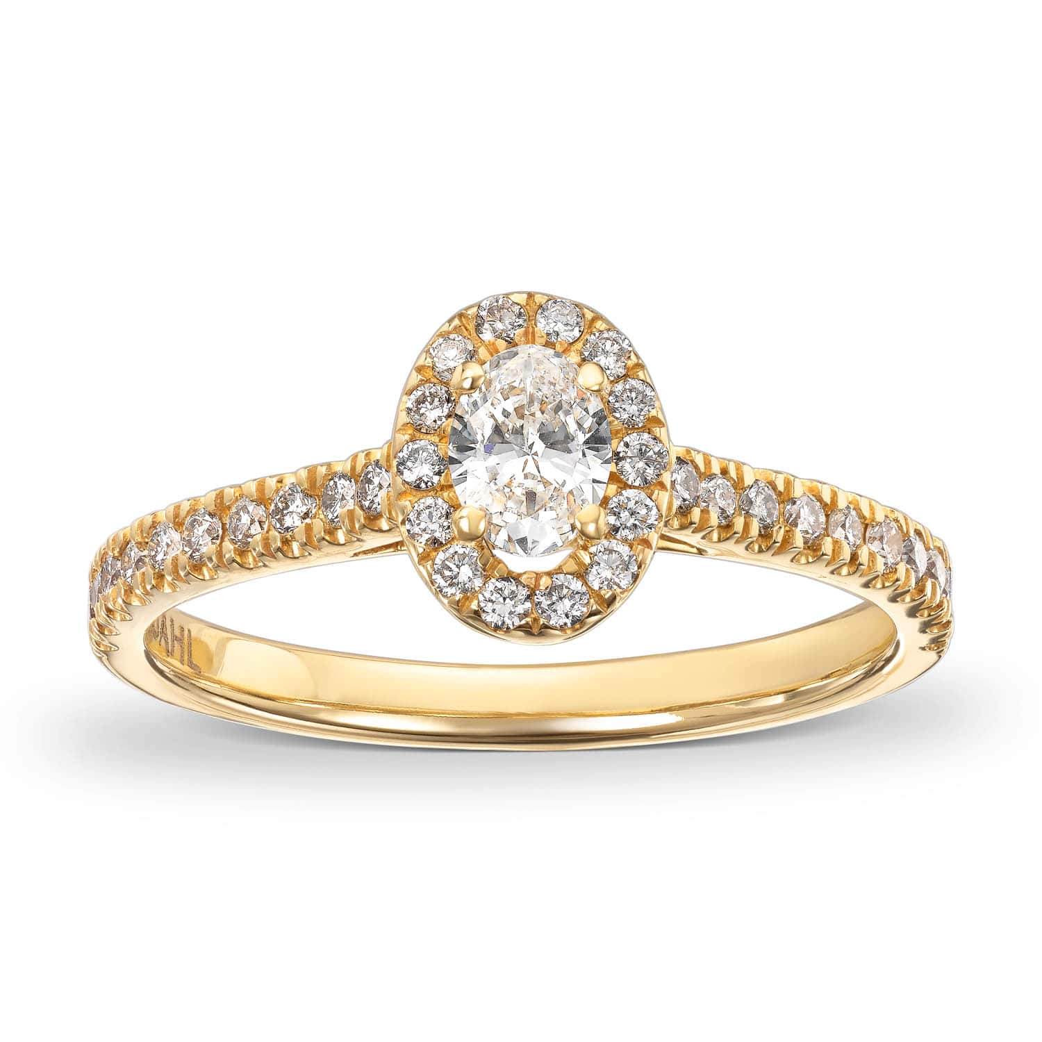 Diamantring i gult gull med Oval midsten, halo og sidestener 0,55 TW/SI