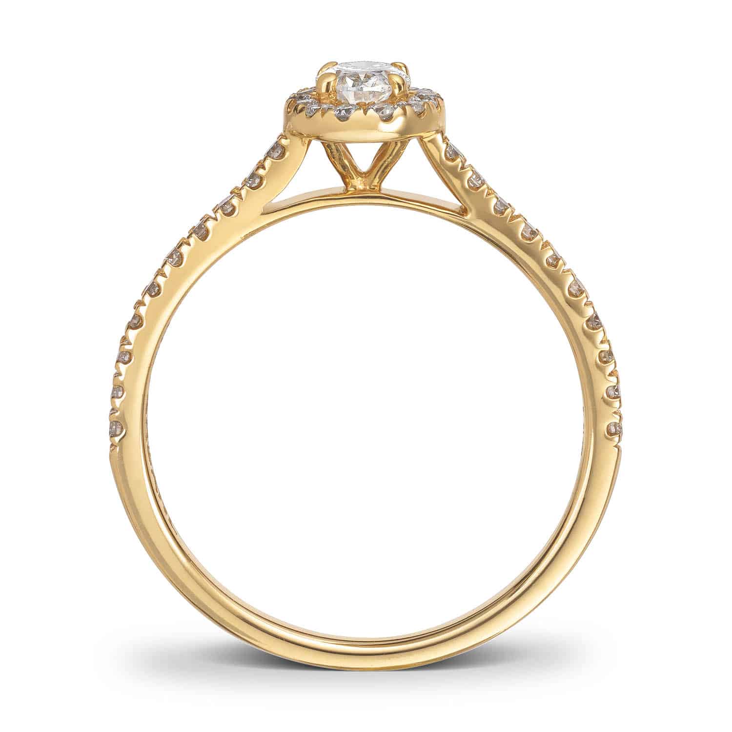 En eksklusiv og tidløs diamantring i 14K gult gull, satt med en ovalslipt midtstein på 0,26ct i kvalitet G/SI1.