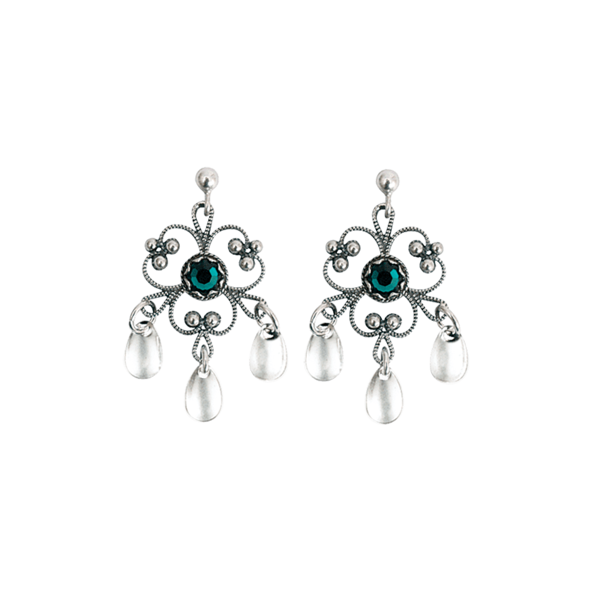 Flotte, tradisjonelle bunadsøyredobbar i oksidert sølv med grøn stein i midten. Nydelege inntil bunader med grønt dekor, til dømes kvinnebunadene frå Sogn, Sunnfjord og Nordfjord.