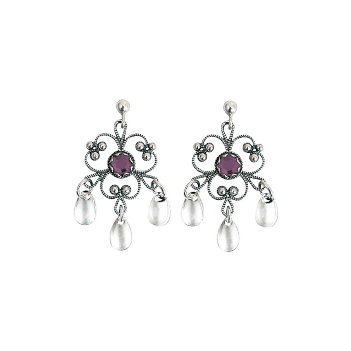 Flotte, tradisjonelle bunadsøyredobbar i oksidert sølv med lilla stein i midten. Nydelege inntil bunader med innslag av lilla dekor, til dømes vinterbunadene til Voss og Hardanger.